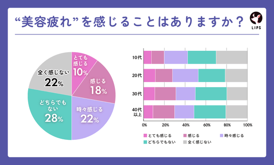 "美容疲れ"も最近耳にするようになったワードのひとつ。LIPSユーザーの中でも「とても感じる」「感じる」「時々感じる」の回答を合わせると、約半数の人が"美容疲れ"を感じることがあると判明しました。