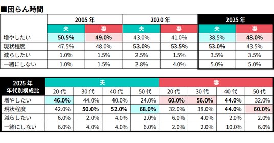 2025年の年代別では、20~30代の妻で「増やしたい」が6割前後(20代60.0%、30代56.0%)と高く、若年層ほど“団らん時間”への意識が強い傾向が見られました。夫も若年層では比較的高水準ですが、50代では24.0%にとどまります。