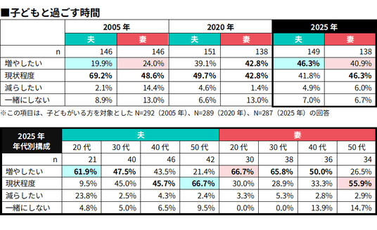 2025年の年代別では、20代が夫61.9%、妻66.7%と最も高く、若年層ほど“子育て時間”への前向きな意識が強い傾向が見られました。一方、50代では「現状程度」が多数派となり、育児のピークを過ぎた世代では“維持志向”が強まる様子もうかがえます。