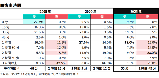 「0分」と回答した夫は22.5%から9.5%へと大幅に減少し、“家事ゼロ”層が明確に減りました。一方で、妻の「3時間以上」が42.5%から23.0%へと半減し、「1時間~2時間」層が増加しています。
