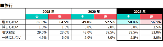 「増やしたい」と回答した割合は、夫50.0%、妻56.5%と高水準を維持しています。2005年と比べるとやや減少しているものの、「一緒にしない」と回答した層は少数にとどまり、旅行は依然として夫婦の絆を深める時間として位置付けられているようです。