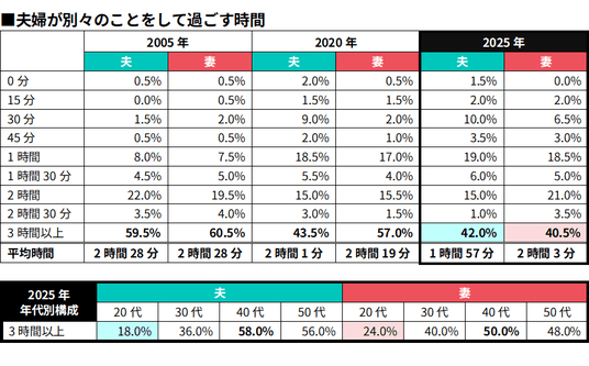 休日に夫婦が別々のことをして過ごす平均時間は、夫「1時間57分」、妻「2時間3分」。2005年の「2時間28分」からやや減少したものの、会話時間(夫1時間11分、妻1時間14分)を上回っており、“自分の時間”を確保するスタイルが定着しています。