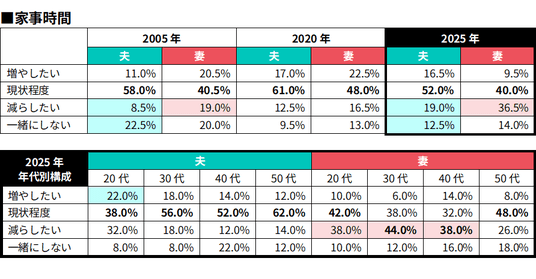 また、「一緒にしない」と回答した夫は、2005年の22.5%から2025年は12.5%へと減少。家事を“夫婦で担うもの”と捉える意識が、この20年で定着しつつあることがうかがえます。