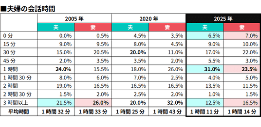 ◇夫婦の会話時間は20年で20分減少。「会話ゼロ」の休日も約7%に増加し、休日は“静かな共存スタイル”へ