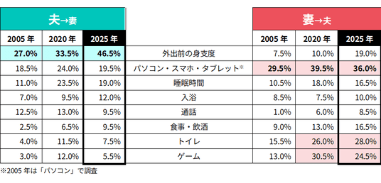 夫が妻に対して最も「長すぎてイライラする」と感じているのは「外出前の身支度」(46.5%)。2005年の27.0%から約2倍に増加しており、“待たされること”へのストレスが年々強まっていることが分かります。