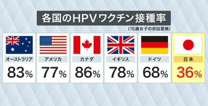 2024年の接種率で比較すると、70〜80%を超えている国が多いのに対し、日本は36%と各国の半分ほどにとどまる。