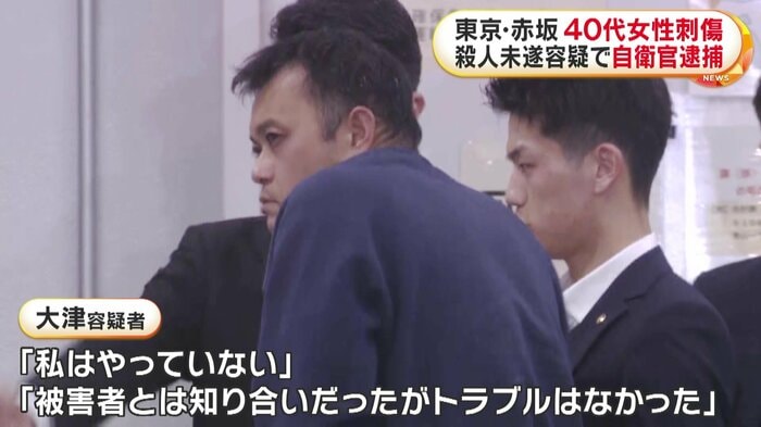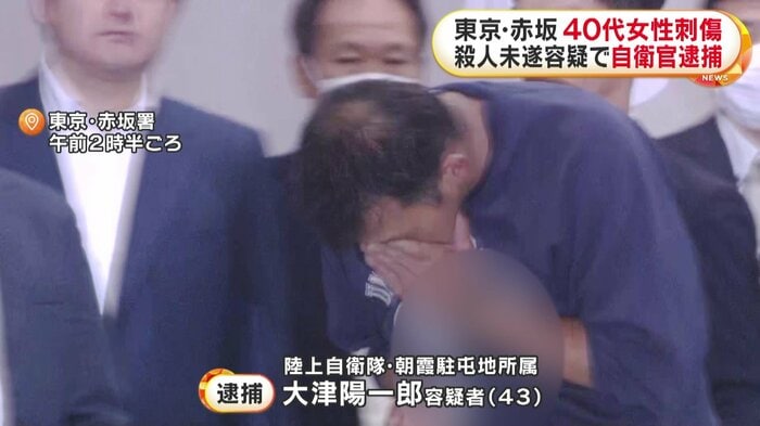 陸上自衛隊・朝霞駐屯地に所属する大津陽一郎容疑者(43)は11月16日、港区赤坂のライブハウスの前で女性(40代)の腹などを刃物で刺し、殺害しようとした疑いが持たれている。