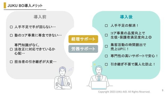 バックオフィス業務に関しまして、塾エイドでは「JUKU BO」というサービスを展開しております。何かと事務工数がかかりがちな経理・労務管理を丸投げできるものとなっておりますので、人手不足や対応時間に追われている、といったお困りをお抱えの方は是非ご連絡ください。
