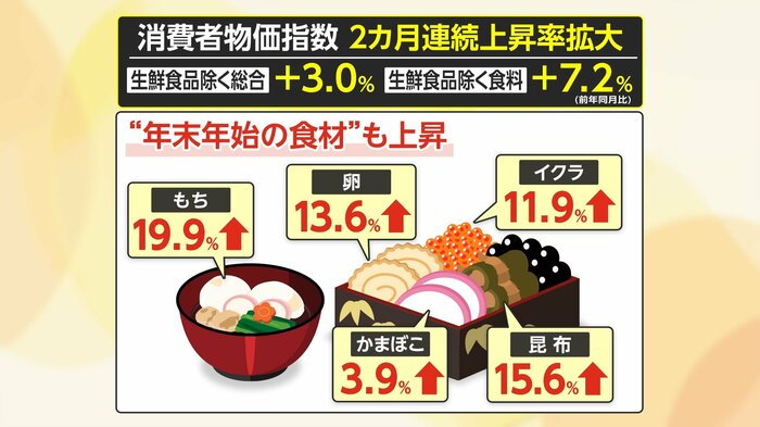 こうしたなか、10月の消費者物価指数は、生鮮食品を除く総合が前年同月比で3.0%上昇した。伸び率が3%台になったのは3カ月ぶりだ。食料は6.7%上昇し、年の瀬に必要とされる食材でも、もちが19.9%、こんぶが15.6%、鶏卵が13.6%、いくらが11.9%となるなど上げ幅が目立っていて、家計の負担増が続く実態が浮き彫りになっている。