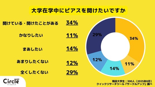 「髪染めをしている・したことがある」と答えた学生は全体の69%と多数を占め、日常的なおしゃれとして定着している。一方、「ピアスを開けている・開けたことがある」も34%と一定数いるが、「全く開けたくない」(29%)派も多く、分かれ目が見える。