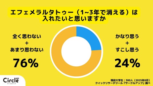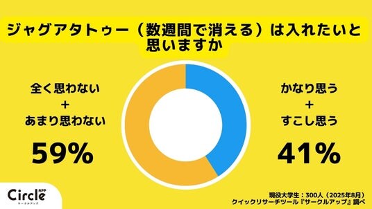 しかし、「1~3年で消えるエフェメラルタトゥー」に「入れたい」と答えた人は24%、「数週間で消えるジャグアタトゥー」の場合41%、「数日で消えるタトゥーシール」の場合59%という結果になった。「あまり思わない/全く思わない」が多数派ではあるものの、タトゥー=永遠ではない表現への興味もうかがえる。ファッションやフェス文化と連動して、短期間で消えるジャグアタトゥーなど気軽なタトゥーが若者の間で受け入れられつつある兆しも見える。