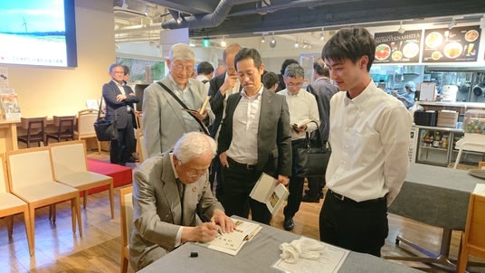 著作『至誠天に通ず―小長啓一「人生を語る」』にサインを行う小長Alumni(全学同窓会)会長