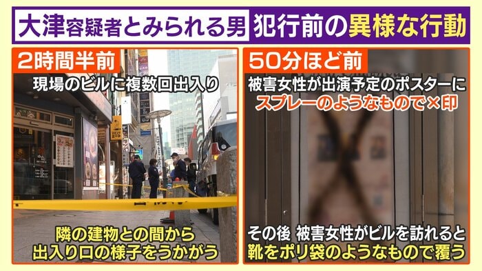 さらに50分ほど前には、被害女性が出演予定のポスターにスプレーなどで×印を入れ、その後、被害女性が現場に到着すると、靴をポリ袋のようなもので覆ったことが防犯カメラの映像などからわかっています。