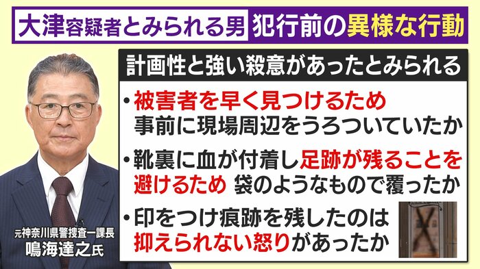 大津容疑者と見られる男の行動には、「計画性と強い殺意」があったと見られ、靴裏をポリ袋で覆ったのは、血が付着して足跡が残ることを避けるための行動で、かなり計画的。