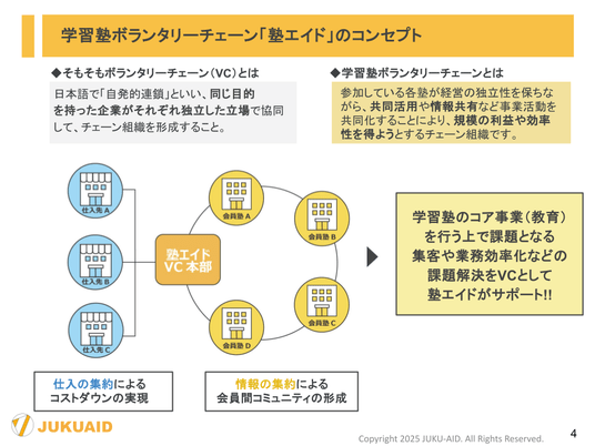 塾エイドは「塾の成功と生徒の成長を両立させ、より広く価値を提供したい」という理念のもと、塾の先生方がコア業務である「教育」に集中できるような仕組みづくりを日々実践しております。教育業界を取り巻く環境は日々変化しており、塾エイドが情報の集約を行って、セミナーやコンテンツを通して発信していくことで、効率よく情報収集いただけます。今回アンケートの実施により、「集客」「集客」「人材・育成」「運営」それぞれの観点から、塾経営者・教室長が抱える様々な課題が分かりました。塾エイドではボランタリーチェーンの仕組みを活かし、「情報の集約」「仕入の集約」の2点でこうしたお悩みを解決できるように努めてまいります。
