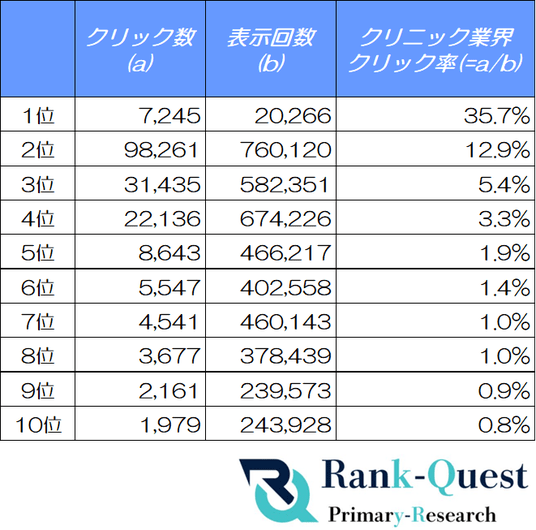 SEO対策支援で4,300社を誇るランクエスト(https://rank-quest.jp/column/column/how-to-seo/ )は、クリニックのクライアントサイトを対象に、2025年10月の検索順位ごとのクリック率(CTR)を計測しました。