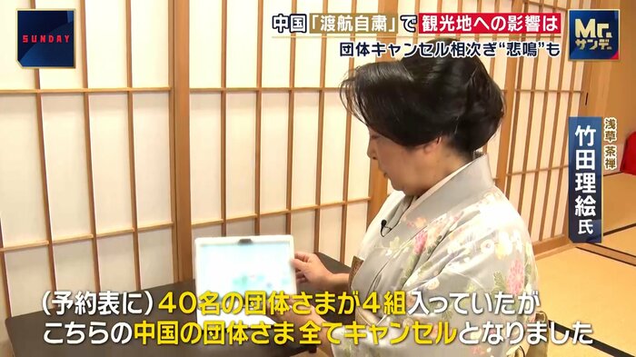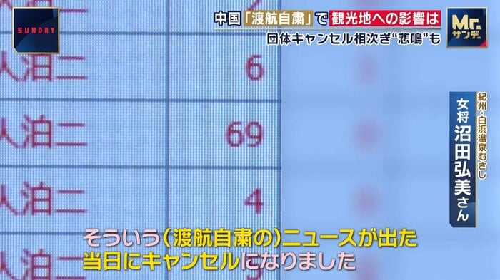 大きな団体をいただいておりましたので(中国客)69人の方だったんですが、そういう(渡航自粛の)ニュースが出た当日にですね、キャンセルになりました。30ルーム以上抑えていたかと思います。