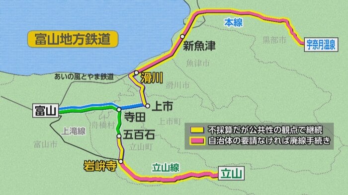 赤字経営が続く富山地方鉄道は、採算がとれない本線の滑川―宇奈月温泉駅間と立山線の岩峅寺―立山駅間で、沿線自治体から支援などの方針が示されなければ来年11月末で廃線にするとしています。