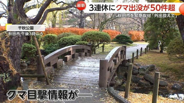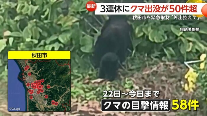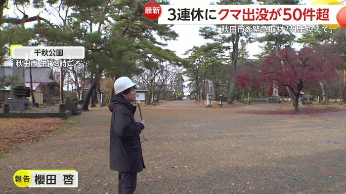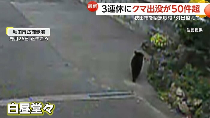 番組は、クマの出没が相次ぐ秋田市を緊急取材した。この3連休だけで、秋田市では街中などで50件を超えるクマが出没している。