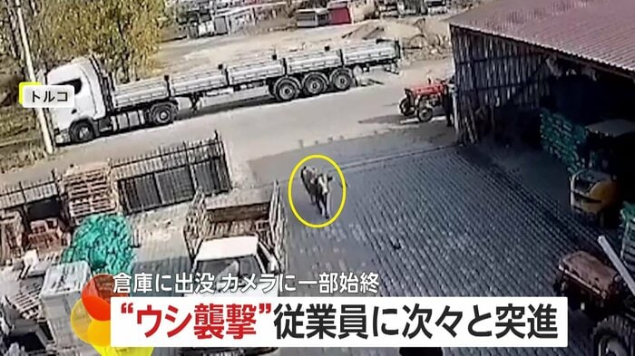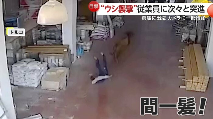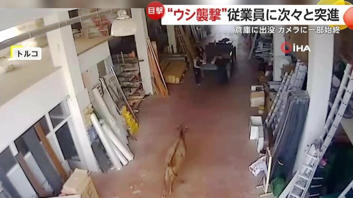 トルコで、突然倉庫に現れた牛が従業員に突進する様子がカメラに捉えられた。従業員たちは逃げまどいながらも牛を外へ追い出したという。