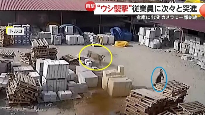 現地メディアによると、牛の襲撃によるケガ人はおらず、その後、牛は従業員らによって倉庫の外へ追い出されたという。