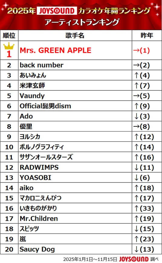 今年デビュー10周年を迎えたMrs. GREEN APPLEが、2年連続で1位を獲得し、その人気の高さを証明!「ライラック」をはじめ、総合TOP30には計5曲がランクインするなど、2025年の音楽シーンを象徴する存在となりました。また、今年「THE FIRST TAKE」で公開された「コイスルオトメ」が大きな話題を集めたいきものがかりは、昨年33位から16位に浮上。来年グループ活動を終了することを発表した嵐も、昨年23位から19位にランクアップしています。