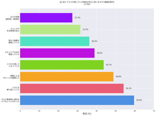 その結果、「マスク着用時に適切なケアをしていなかった」が59.6%で最多となり、次いで「ニキビを繰り返していた」(54.1%)、「摩擦によるダメージが蓄積した」(48.8%)という結果になりました。