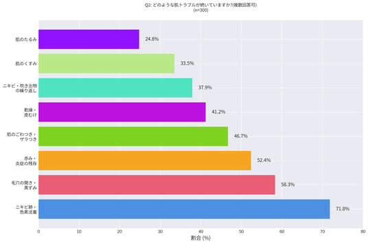 その結果、最も多かったのは「ニキビ跡・色素沈着」(71.8%)、次いで「毛穴の開き・黒ずみ」(58.3%)、「赤み・炎症の残存」(52.4%)という結果になりました。