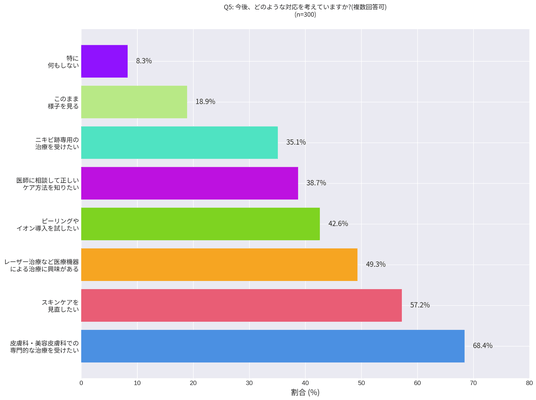 その結果、「皮膚科・美容皮膚科での専門的な治療を受けたい」が68.4%で最も多く、次いで「スキンケアを見直したい」(57.2%)、「レーザー治療など医療機器による治療に興味がある」(49.3%)という結果になりました。