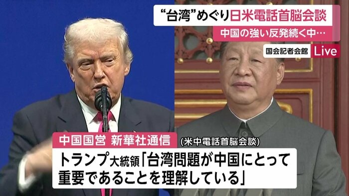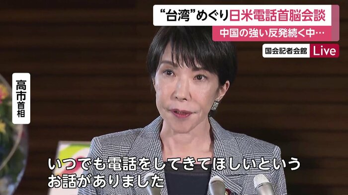 高市総理大臣の「台湾有事」をめぐる国会答弁に中国が強く反発する中、高市総理大臣は先ほど、アメリカのトランプ大統領と電話で会談した。