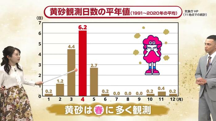 黄砂が観測された日数の平年値(1991年~2020年の平均)を示したグラフを確認すると、黄砂の観測は3月、4月、5月に集中しており、まさに「春の風物詩」であることがわかります。秋に観測されることは比較的珍しいため、「季節はずれの使者」という表現となりました。