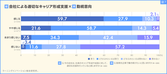 - 会社からの適切なキャリア形成支援、「感じる」若手社員の勤続意向割合は「感じない」の6倍以上(図7)