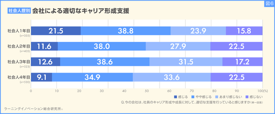 さらに会社からのキャリア形成支援の状況について調べました。今の会社は、社員のキャリア形成や成長に対して、適切な支援を行っていると感じますかという質問に対する回答を社会人歴別で比較したところ、会社からの支援が適切だと「感じる」回答割合は、社会人歴が上がるにつれて低下傾向が見られ、社会人1年目社員では21.5%でしたが、社会人4年目社員では1割を切りました。(図6)。