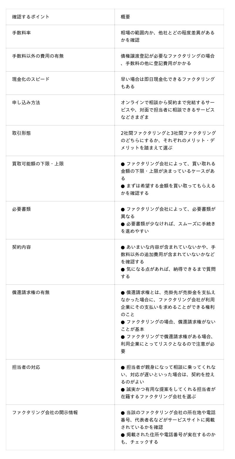 先述した通り、ファクタリング会社によって契約内容や審査基準、手数料率、サポート内容などは異なります。複数のファクタリング会社に相談・見積もり依頼をした上で、自社に適した会社を選ぶことが、失敗しないためのポイントです。