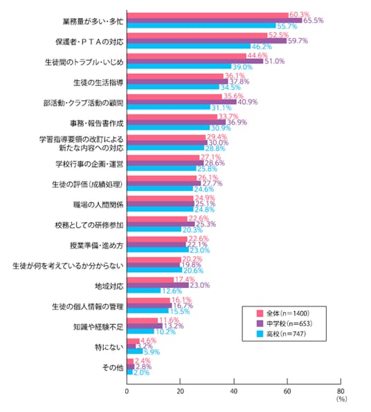 次いで、「保護者・PTAの対応」(全体52.5%、中学校59.7%、高校46.2%)、「生徒間のトラブル・いじめ」(全体44.6%、中学校51.0%、高校39.0%)、「生徒の生活指導」(全体36.1%、中学校37.8%、高校34.5%)、「部活動・クラブ活動の顧問」(全体35.6%、中学校40.9%、高校31.1%)、「事務・報告書作成」(全体33.7%、中学校36.9%、高校30.9%)など、多岐にわたっていることがうかがえます。