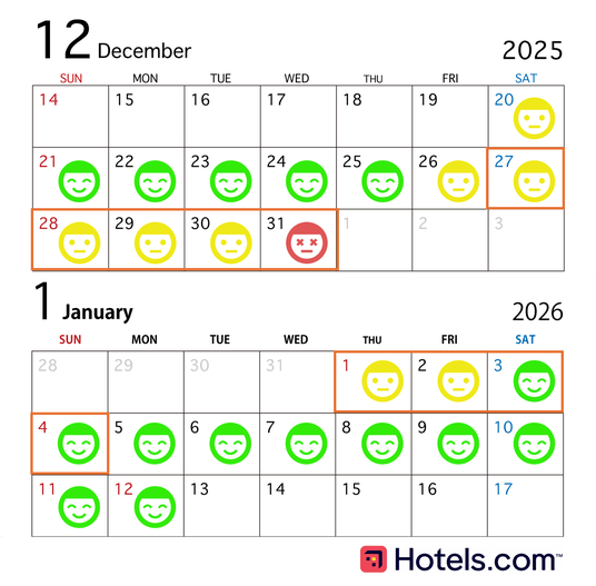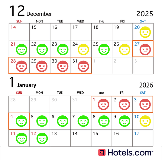 A5. Hotels.comのホテル検索データ*6によると、12月26日(金)から1月2日(金)に宿泊施設が混雑すると予想されます。そのため、混雑を避けたい場合は、12月21日(日)、22日(月)に出発するか、1月3日(土)以降の出発がおすすめです。