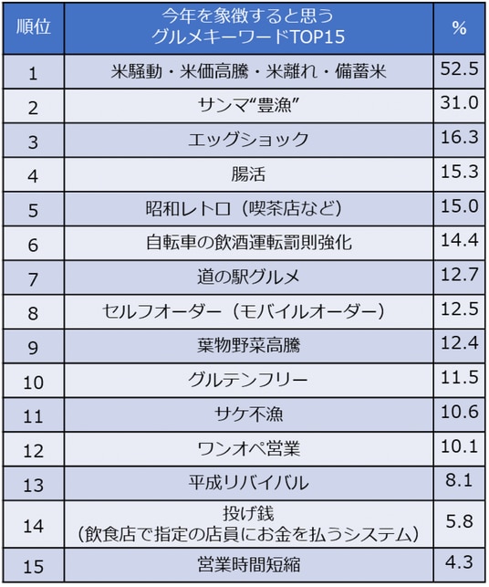 ホットペッパーグルメ外食総研が挙げた20の選択肢の中から「今年を象徴すると思うグルメキーワード」を聞いたところ、過半数が「米騒動・米価高騰・米離れ・備蓄米」を選び、圧倒的1位に。備蓄米放出は連日ニュースになりましたし、日々の生活でもお米の高騰を痛感させられている人が多いことが推測されます。2位になった「サンマ“豊漁”」は逆にうれしいニュース。実際に豊漁だったのかはあいまいですが、年々高騰し続けていたサンマが比較的手ごろな価格で店頭に並び、SNSでも「久しぶりにおいしいサンマを食べられた」という声が見られました。そのほかにも3位「エッグショック」、9位「葉物野菜高騰」、11位「サケ不漁」など、物価の乱高下に振り回された1年でした。