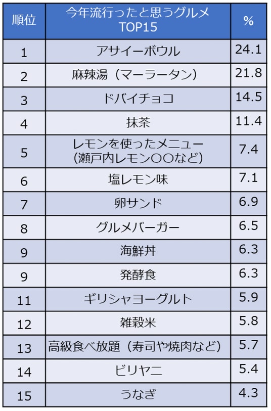 ホットペッパーグルメ外食総研が挙げた37の選択肢の中から「今年流行ったと思うグルメ」を聞いたところ、1位は「アサイーボウル」でした。「アサイー」は昨年の調査で2位でしたが、今年はコンビニで販売されるなどより多くの人の目に触れることとなりました。続く2位は「麻辣湯」。こちらもコンビニで発売されたほか、日本各地で店舗がオープンするなど大きな話題になりました。3位「ドバイチョコ」はここ数年SNSで話題になっていましたが、今年になって各社が発売して手に取りやすくなりました。1位~3位は全て韓国のSNSでも話題になったものであり、その影響の大きさがうかがえます。