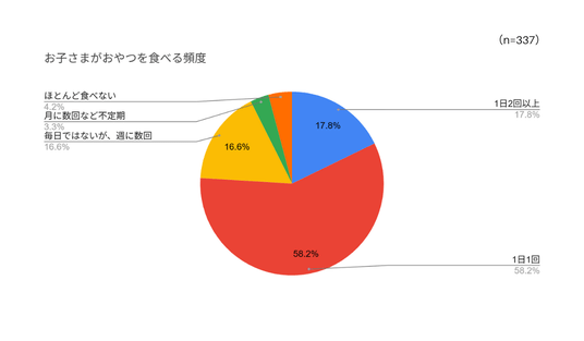 まずはお子さんがおやつを食べている頻度について訊いたところ、「1日2回以上」食べると回答した方が17.8%、「1日1回」が58.2%に上りました。これらを合わせると、回答者の76%のお子さんが毎日おやつを食べていることになります。「毎日ではないが、週に数回」食べるお子さんも16.6%と、ほとんどのお子さんが定期的におやつを食べていることが分かりました。