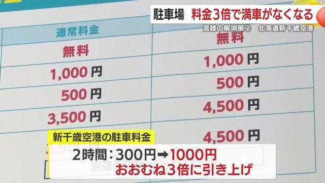 北海道の新千歳空港では、10月10日に駐車料金を改定し、2時間の駐車料金を300円から1000円に引き上げた。新千歳空港によると、この料金改定以降、駐車場は一度も満車になっていないという。