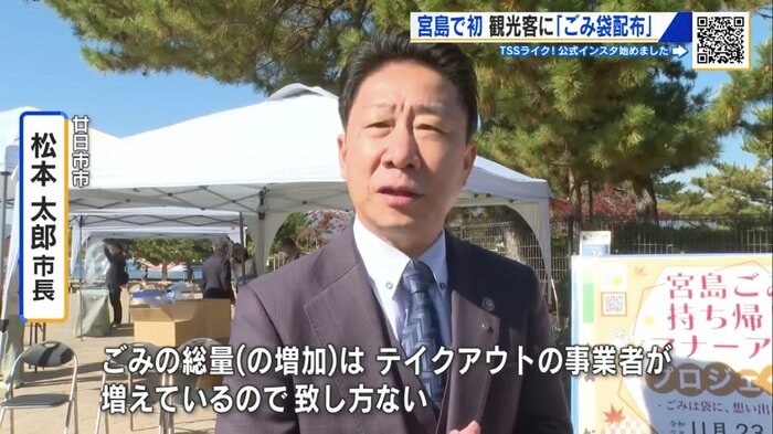この3連休で配られたごみ袋は4万枚。宮島に広がるカラフルな袋が、観光地の景色をほんの少し変えていた。