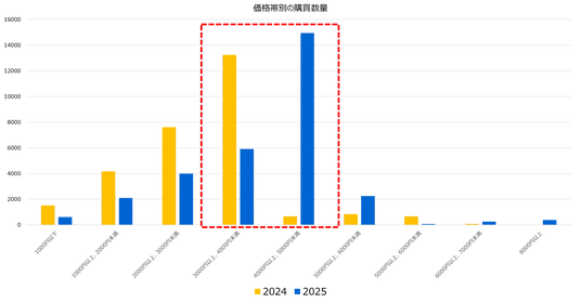 2024年の同時期と比較して、銘柄米・ブレンド米・備蓄米全体での平均購入単価が上昇。最も購入が多かったのは4,000円以上5,000円未満で、前年より1,000円高い水準となりました。