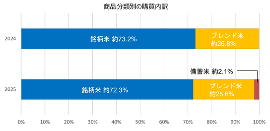 前年とほぼ変わらず、銘柄米は依然として高い水準を維持しています。ブレンド米や備蓄米の購入も一定数みられるものの、全体構成に大きな変化はなく、銘柄米が主流の選択肢として継続していることが伺えます。これは、自ら選んで銘柄米を選んだ層と備蓄米などが店頭に置かれておらず選択肢制約による購入層の両方が一定程度存在すると考えられます。