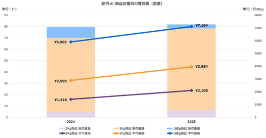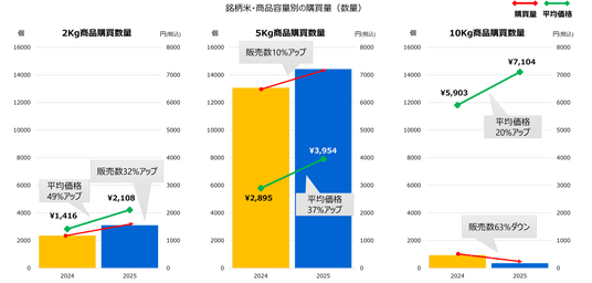 銘柄米の容量別数量では、2kg商品(前年比+32%)と5kg商品(同+10%)が増加する一方、10kg商品は前年比▲63%減となり、“大容量”から“小容量”へとシフトする動きが明確となっています。