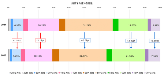 銘柄米における購買は、50代以上の購入が増加の一方で40代以下は減少傾向となりました。