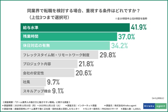同業界で転職を考える際、重視されるのは「給与」と「労働時間」のバランスであることが明らかになりました。