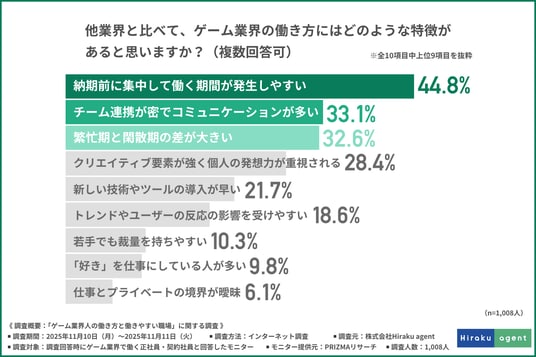 「他業界と比べて、ゲーム業界の働き方にはどのような特徴があると思うか」と尋ねたところ、『納期前に集中して働く期間が発生しやすい(44.8%)』が最多で、『チーム連携が密でコミュニケーションが多い(33.1%)』『繁忙期と閑散期の差が大きい(32.6%)』となりました。