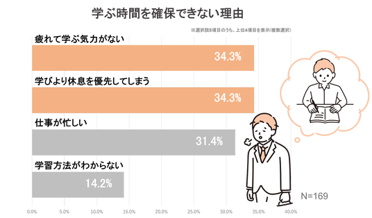 4割以上(40.7%)が“学びの時間を確保できていないと感じている事が明らかに※2。理由は、「疲れて学ぶ気力がないから(34.3%)」「学びより休息を優先してしまうから(34.3%)」など疲労が要因となっており※3、理由の約7割が、「疲れ」からきている事が感じられる結果に。
