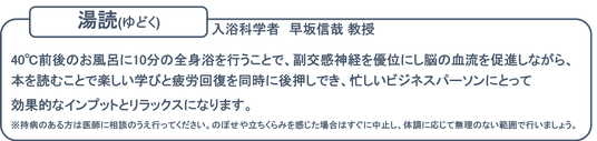 こうした結果を受けて、入浴科学者 早坂信哉教授は40℃前後の湯船に10分ほど浸かりながら読書を行う“湯読(ゆどく)”を推奨しています。