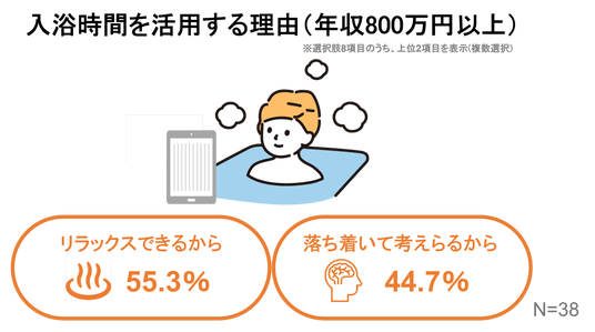 また、年収800万円以上の層が入浴中に時間を活用する理由としては、「リラックスできるから(55.3%)」「落ち着いて考えられるから(44.7%)」が上位に挙がりました※8。このように、入浴の効果を“学びの時間”に結びつける人が一定数見られ、入浴時間を“湯読”として活用する可能性が示唆されます。